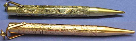 梅笔的挂环式自动铅笔, 上为罕见的绿金笔, 下为黄金笔 (David L. Moak, 2004)*