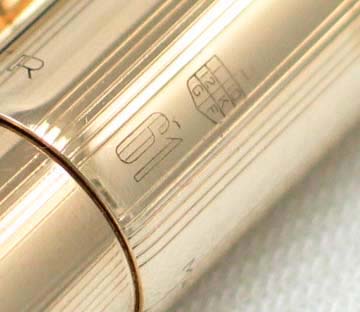 帕克61, 帕克在51和61笔款都以如上较花俏的方式表示包金笔的成分, 盾牌型的最上方标示的是十分之一包金, 第二行为金的纯度12K, 再下则标明GF以示包金笔
