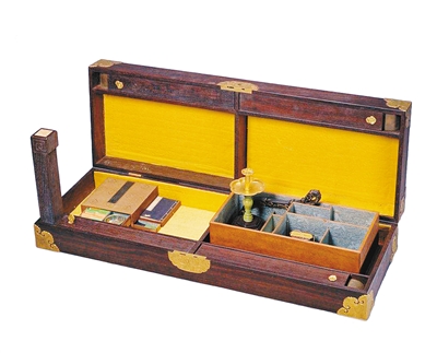 清宫文具匣的功能趋于多样化,还出现了一种组合多用的旅行文具匣,十分便于外出使用。故宫博物院现藏一件清乾隆时期的旅行文具匣,其为紫檀木制,长74厘米,宽29厘米,高14厘米,匣底和匣盖各高7厘米,可折叠展开为桌,合闭为箱;桌腿设计在箱槽内,用活动薄板支撑,再用铜鎏金暗扣固定,非常巧妙。匣内设计有两个同样大小的屉盒,每一屉盒都有两层形式各异的多宝格,放置64件套小巧精细的文房四宝及文杂器具,如白玉洗、松花江石砚、玉臂搁、笔筒、兽镇、石章、描金云龙纹笔等,每件器具都有固定的位置,器格按其形状大小而特制,严丝合缝。这些器物均是乾隆皇帝喜用、赏玩的文房佳品,其中清代宫廷画家周鲲的设色山水画小手卷和山水小册页及《类苑俪语》上下二册,均形制尺寸小巧,为掌中赏玩之精品。除了文具,匣内还装有双陆棋盒一个,盛有棋子、棋盘,还配备有小蜡盏,蜡台上用支架固定铜镀金上画珐琅西洋风景图立罩。此文具匣集多种文房器具于一体,随时随地都可打开作为炕桌,用以题诗赋词、处理政务、对弈论棋以及欣赏书画。据造办处档案记载,此套文具桌匣制成于乾隆二十二年,为清代乾隆时期文房器具中的杰作。