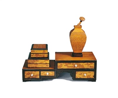 2005年12月,上海某拍卖行上拍了一件清中期湘妃竹黄几式文具匣,最终以15.4万元成交。该文具匣为四屉小机,上承一瓶式盒,二书式小盒,如意一柄。小几以黄杨木为基,上用文竹工艺,贴湘妃竹片,镶紫檀木边,雅致大方,匠心别具。二书式小盒为重叠摆放,以竹为本,壁为湘妃竹片组成的自然花纹。小盒上有文“入则孝出则弟(悌),颂其诗读其画”,落梁同书款及山舟方框印款。瓶式盒以肩、腹、腰为界一分为四,均以子母口盒,瓶口斜插如意,似瓶实盒,颇见巧思,此造型寓意“平安如意”。此器采用阴刻、镂空、文竹及镶嵌工艺雕成,是案头文玩清供中很有特色和趣味的器具。 (宗合)