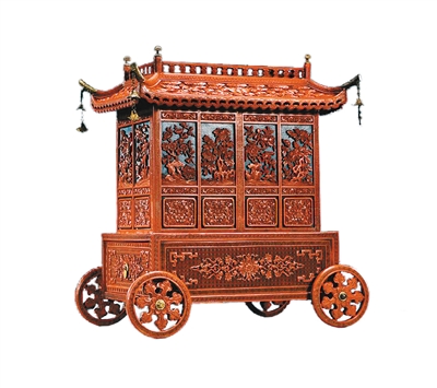 乾隆时期特别大的文具匣也叫文具箱,2011年,北京某拍卖行上拍一件“清乾隆御制雕漆十二花神图宫车式文具箱”,最后以184万元成交。该宫车式文具箱采用宫殿造型,殿顶、殿身与车身三部以活动榫卯相连,殿顶阴刻锦地纹饰,四出殿檐饰以云蝠图案,殿身四面雕十二花卉纹殿门为饰,寓意十二花神,车身四面雕锦地花卉纹以为装饰。全器制作考究,设计新颖,雕刻工艺精湛,美轮美奂,为清代少见御用文房用器品种。