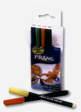 这种笔的笔尖具有超强弹性,写起来像是画家的毛笔。笔画可粗可细、不洇纸,而且墨水不含酸,适合在剪贴簿或其他文具用品上书写。所有的Prang软笔无毒,有经典颜色(6—12支)、金属色(6支装)和金银色套盒(2支装)。另外还有一种新型的金银色套盒,内装金属色记号笔2支和6支。该记号笔是纤维笔尖,直径5毫米,子弹头形状。来源:文体用品与科技