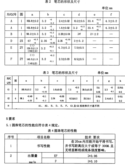 4.1圆珠笔芯的规格按其长度、球珠直径、笔芯头部直径分别命名为67,98,106,140,143型。上述圆珠笔芯的规格尺寸