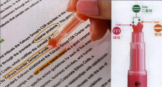 日本一家公司近日推出了一种记号笔,它是仿照卡通动画里独角仙犄角的结构设计的,这只外观非常独特的记号笔叫做BeetJe Tip,它独特之处在于分叉笔头能画出粗线、细线、双线等3种不同的线条,分别是叼毫米、3毫米、5毫米,使用起来相当方便。