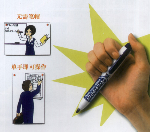 日本出产的一款新型白板笔,不同于以往白板笔,该笔无需笔帽,一只手按压即可使用,类似现在的按式圆珠笔。有圆芯和方芯,有黑色、红色、蓝色和绿色。参考价格170日元。