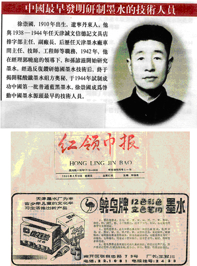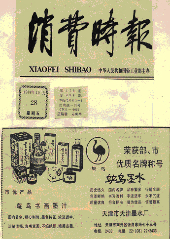 1989年4月,"红领巾报"刊登了天津墨水厂为丰富少年儿童的文化学习生活推出新产品--鸵鸟牌12色彩色变色笔用墨水。